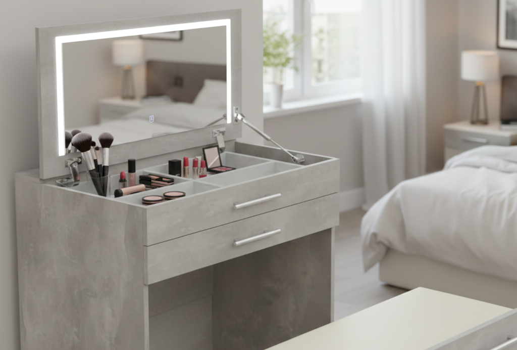 Гримерне дзеркало з нейтральним світлом або гримерний стіл з професійним світлом – це інвестиція в щоденний комфорт. Такі столи часто мають вбудовану LED-стрічку з можливістю вибору режимів, що робить процес нанесення точним і приємним.