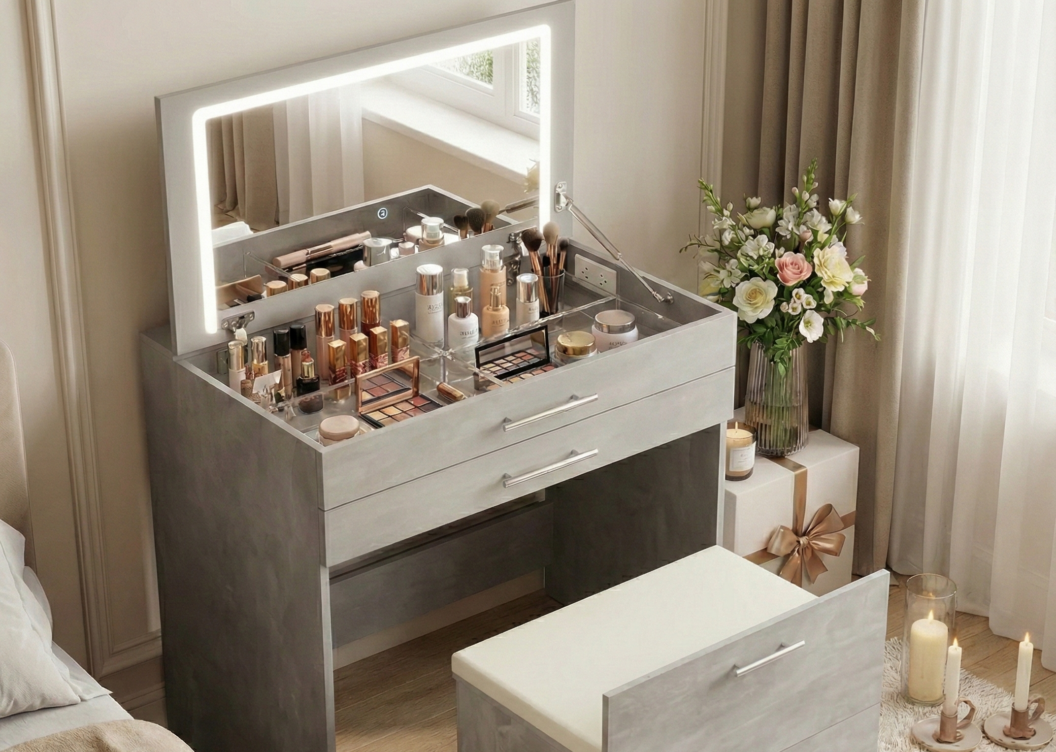 Стіл-консоль з дзеркалом у складеному вигляді виглядає як елегантна консоль або маленький комод – не захаращує простір, не виглядає "як трюмо". У розкладеному – відкривається повноцінна б'юті-зона з великим дзеркалом, LED-підсвіткою по периметру (для ідеального освітлення без тіней), кількома шухлядами, органайзерами для косметики та вбудованою розеткою 220 В.