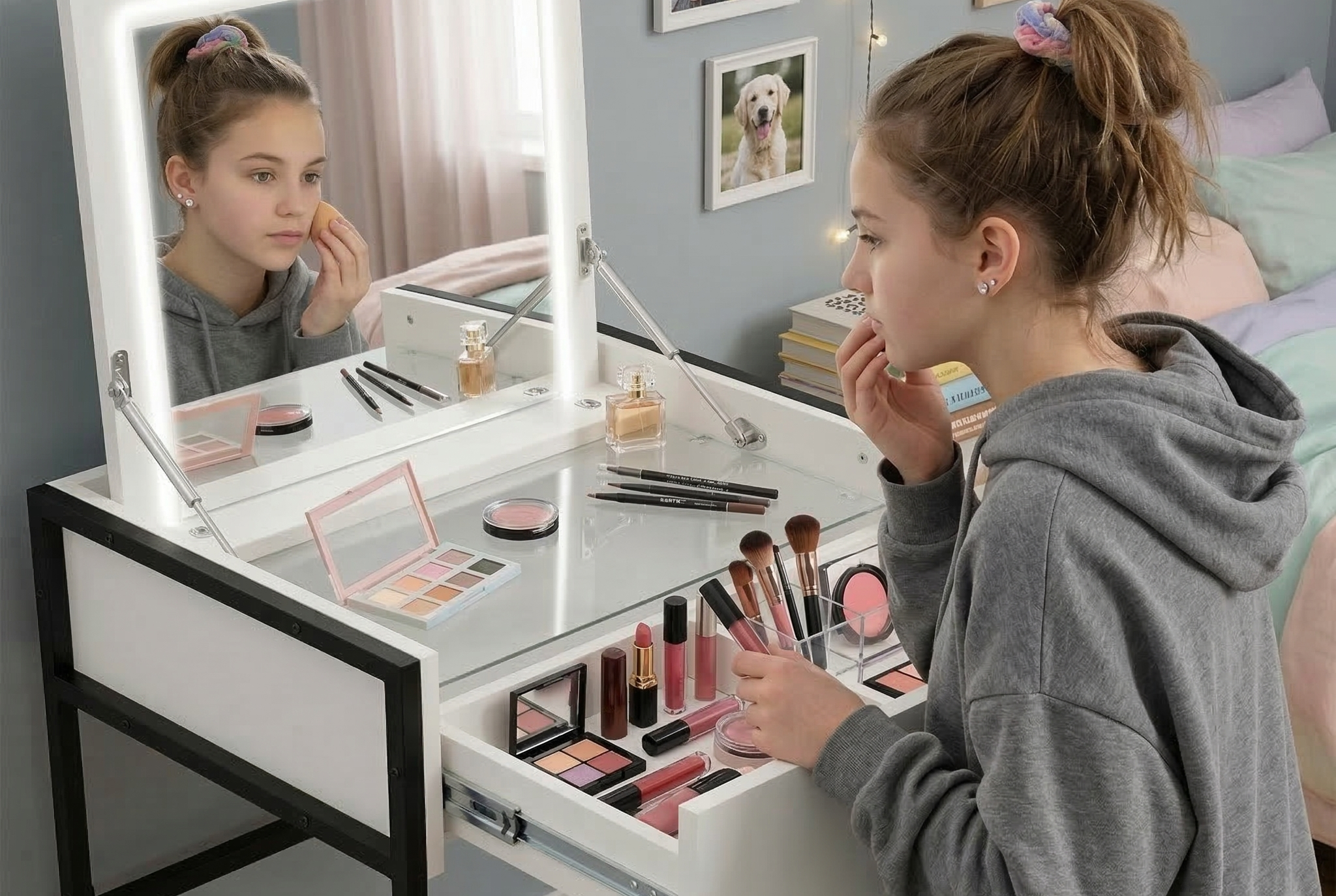 Особое место в жизни юной леди занимает зона ухода за собой. Именно здесь закладываются привычки ухода за внешностью, которые напрямую связаны с общей аккуратностью. Желание макияжный стол для подростка купить часто становится для девочки мощным стимулом поддерживать порядок во всей комнате. Это ее личный "алтарь красоты", который хочется держать в идеальном состоянии.