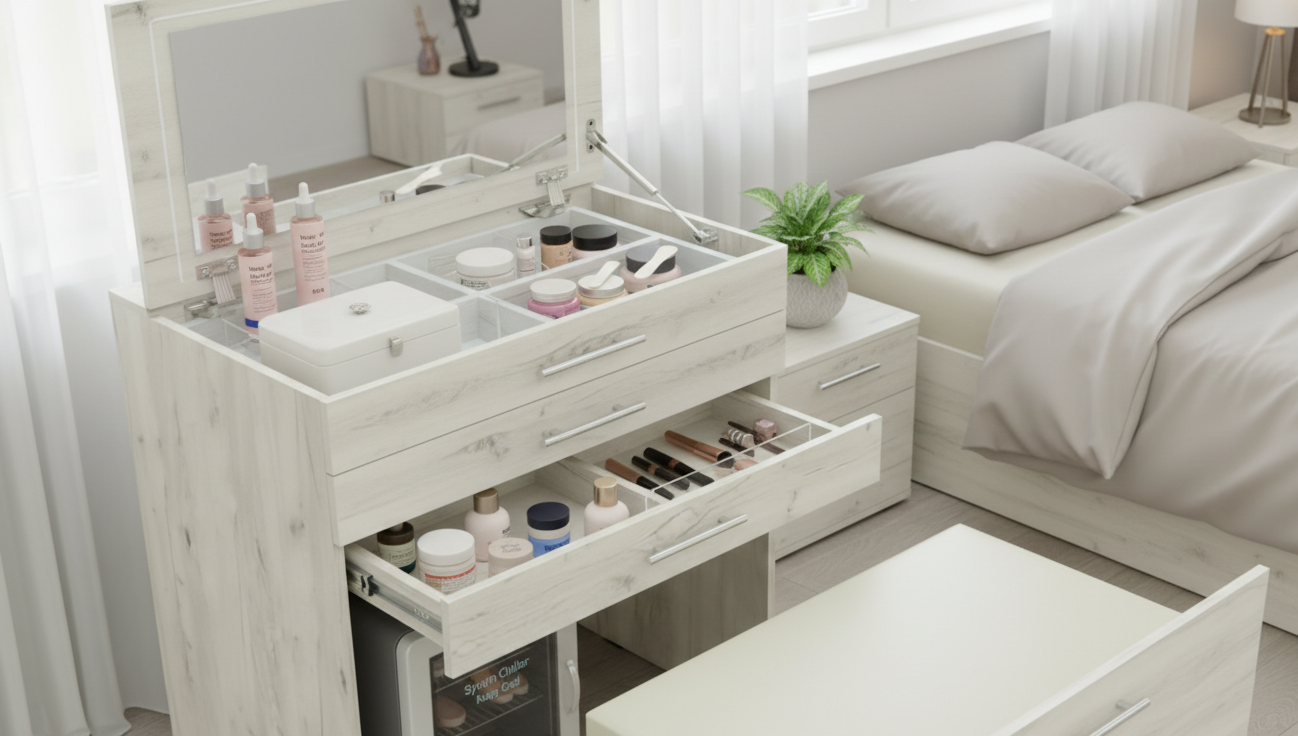 Для тех, кто хочет совместить удобство и защиту, отлично подходят гримерный стол с органайзером или туалетный столик с крышкой. Когда крышка опущена, косметика прячется от света и пыли, а внутри – ящики и ниши для упорядоченного хранения. Стол для макияжа с закрытой нишей или комод для косметики трансформер позволяют держать продукты в темноте, но иметь их под рукой во время макияжа.