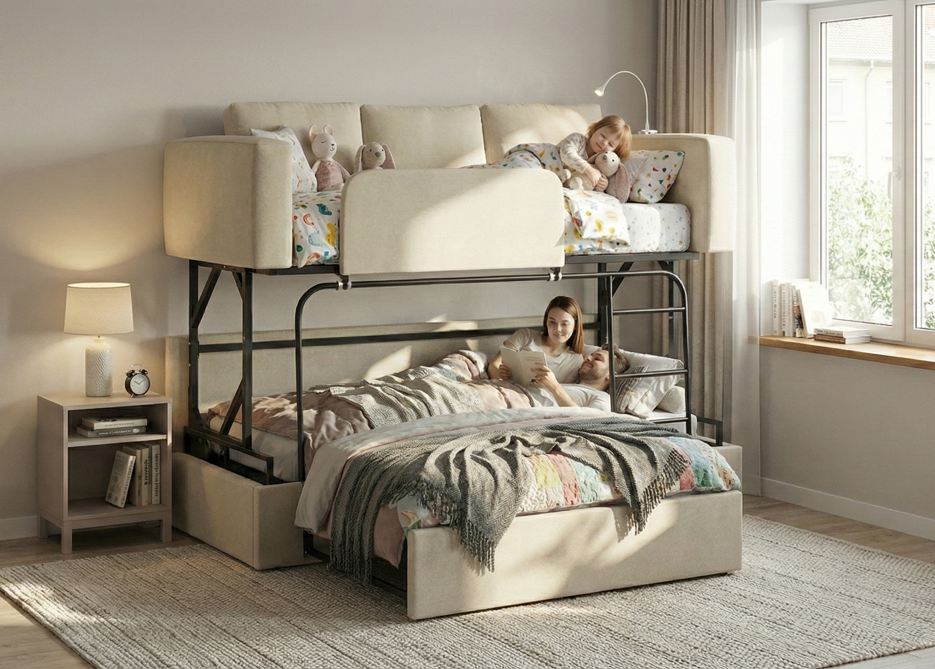 В маленьких квартирах лучше всего работает принцип «одна комната — несколько функций». Днем помещение остается общей гостиной, а вечером за 30-40 секунд превращается в две отдельные спальные зоны. Именно для этого идеально подходит диван-трансформер в двухъярусную кровать, который днем выглядит как обычный стильный диван, а на ночь дает два полноценных спальных места — одно для родителей внизу, второе для ребенка (или двух детей) сверху.