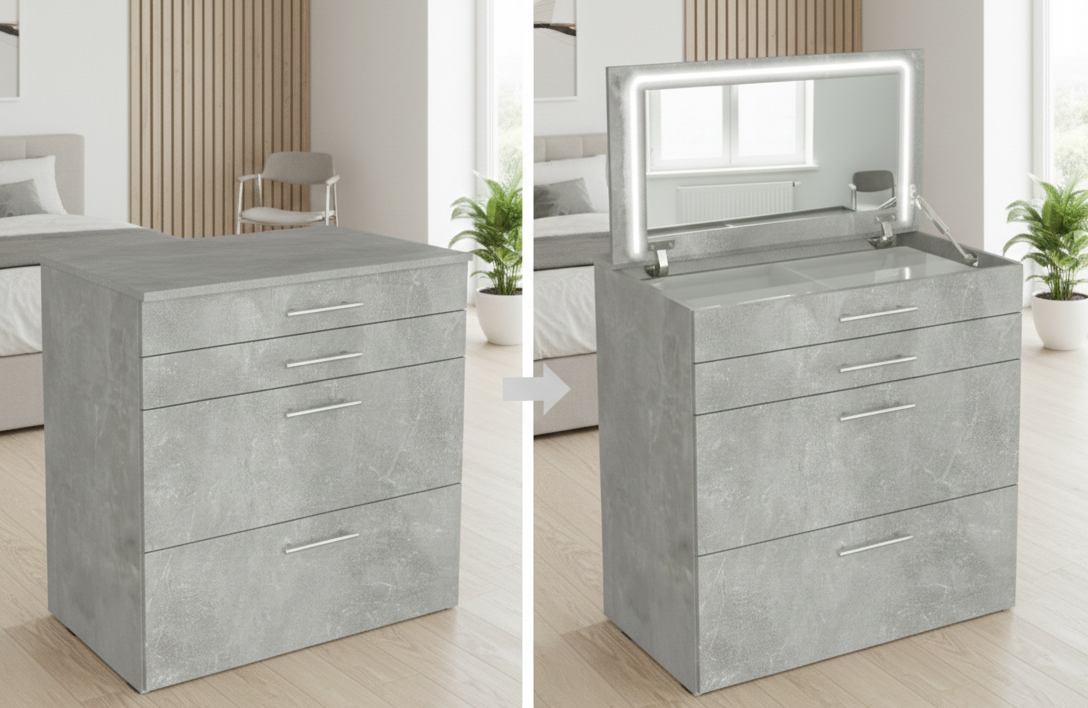 Туалетный столик с закрывающимся зеркалом или стол для макияжа с откидной крышкой – идеальные варианты для спальни. В сложенном виде зеркало полностью прячется, не отражает кровать и не создает тревожного эффекта. Когда нужно – крышка поднимается за считанные секунды, открывая рабочую поверхность с подсветкой.