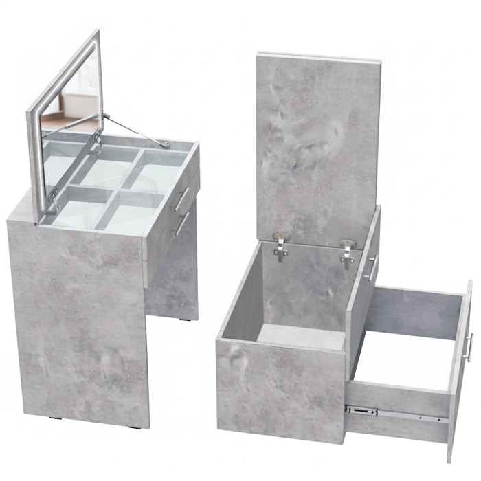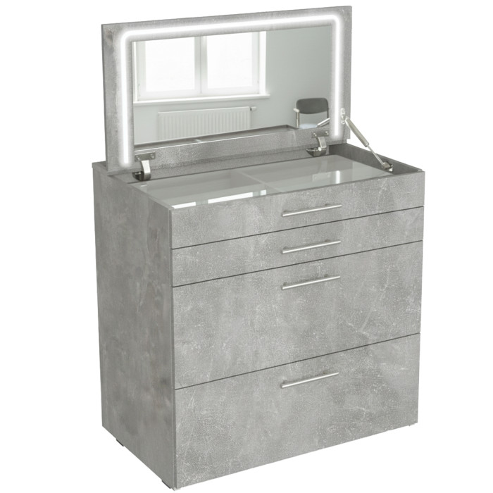 Наш стол для макияжа с LED подсветкой (гримёрное зеркало) обеспечивает профессиональное освещение – всё как на рабочем месте визажиста. Это полноценный гримёрный стол с подсветкой с зеркалом трюмо. Стол оснащён стеклянной прозрачной столешницей, удобными выдвижными ящиками и выдвижным стулом со скрытой нишей для хранения разнообразных принадлежностей.